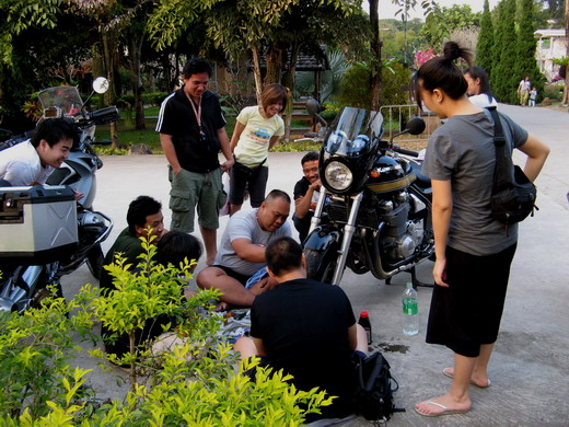คุณบอล HG งานเข้า เบรคหน้าไม่ค่อยดี ป๋าพฤกษ์ก็เลยถอดลูกสูบเบรคหน้าออกมาล้างให้ซะเรียบร้อย ที่มุงกันเยอะๆไม่ได้มาให้กำลังใจนะครับ กำลังรอซ้ำเติมกันอย่างใจจดใจจ่อ |